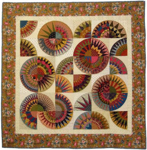 Little did I know when I received an email from Ballaarat Quilters in 2008 requesting me to design and teach a quilt at their upcoming retreat, how many times I would go on to teach that design. The design brief was to make a quilt in the style of a traditional Ballarat Beauties, but scrappy in nature and with a number of variations within the individual blocks. And so... Ballarat Beauties was born. The quilt has an appeal to both traditional quilters, who prefer to use reproduction fabrics and those who make more modern quilts using contemporary fabrics. Ballaarat Beauties is inspired by a number of circular patchwork designs from years gone by. The quilt consists of elements from antique quilts such as New York Beauty, Whig’s Defeat, Georgetown Circle, Mariner’s Compass and Sunburst, as well as some original designs. There are 36 blocks, each one of which comprises a pieced quarter circle set into a square. The squares are then straight-set together and the blocks can be laid out to form complete circles or twisted to create different effects. It is foundation pieced for ease and accuracy.