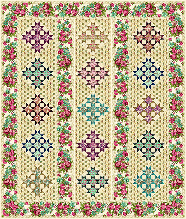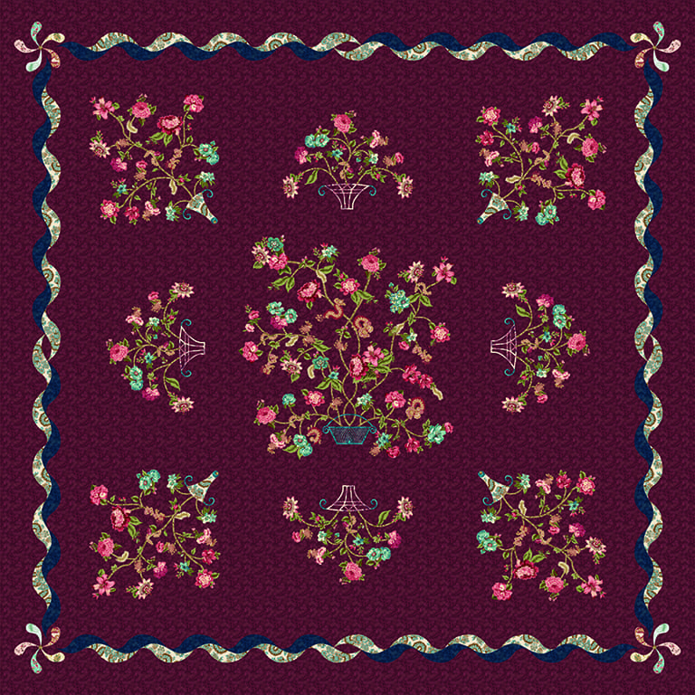Mariakerke includes a stunning floral print in three colour ways with feature flowers in pinks and teals and a beautiful border print featuring two floral sprays each of which is mirrored for effect. The collection also includes two of Michelle’s trademark serpentine prints, one which runs vertically down the fabric and the other a diagonal serpentine floral. Mariakerke also features feathers, paisleys, a delicate calico vine and a wideback abstract wholecloth which would look amazing in any quilt. Michelle can’t wait to begin designing heirlooms of the future using Mariakerke