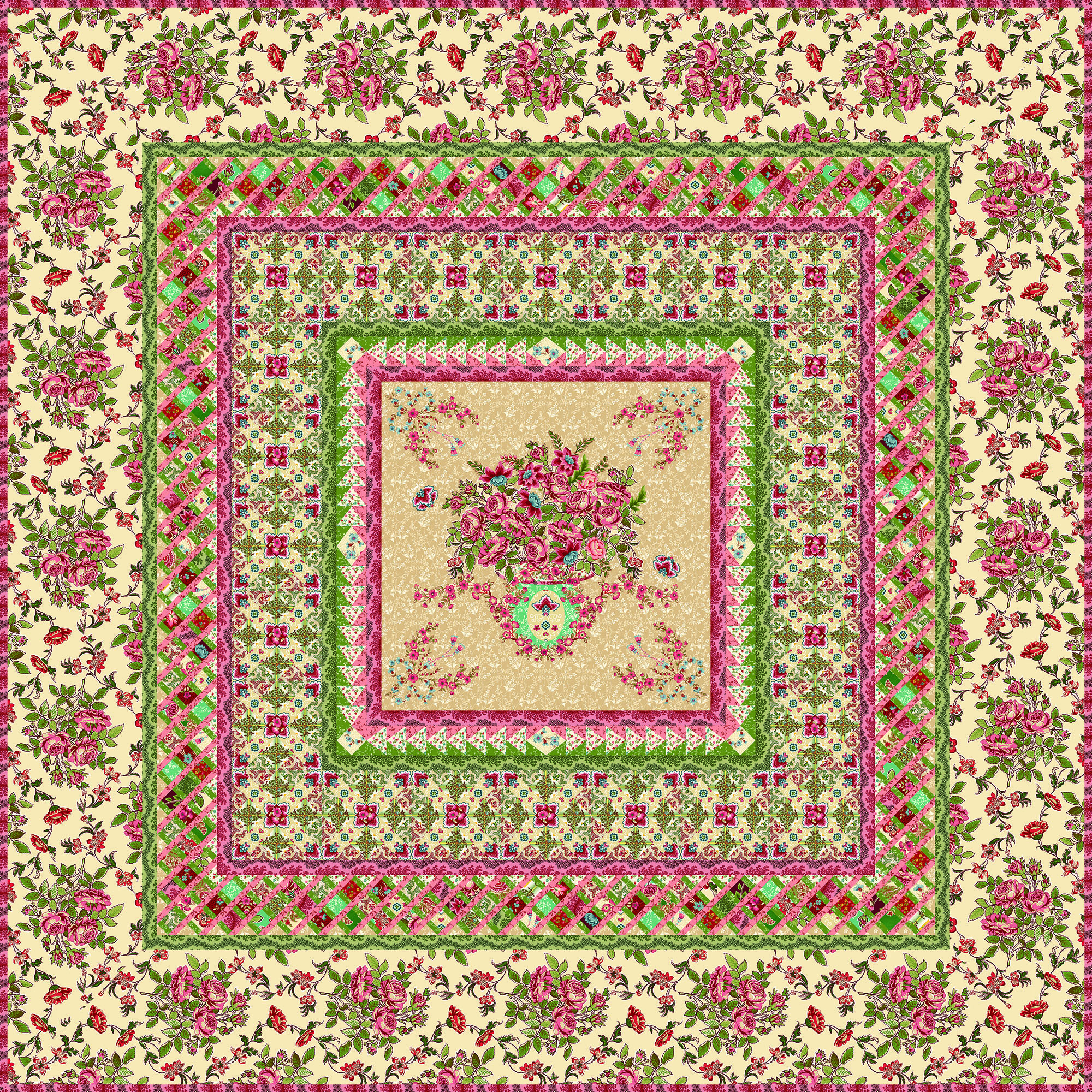 Yeoville Medallion was designed to accompany my beautiful fabric collection Yeoville. The collection includes gorgeous florals reproduced from some early 19th century fabrics and quilts lent to me by my quilting friend, Bev Bannard, as well as many from my own collection. The quilt features all of the fabrics in the fabric line, many of which have been fussy cut to achieve some beautiful effects. A number of different techniques have been used throughout the quilt including hand or machine piecing, freezer paper foundation piecing and needleturn appliqué. Broderie perse, using motifs from the main floral feature prints, feature in the central block.