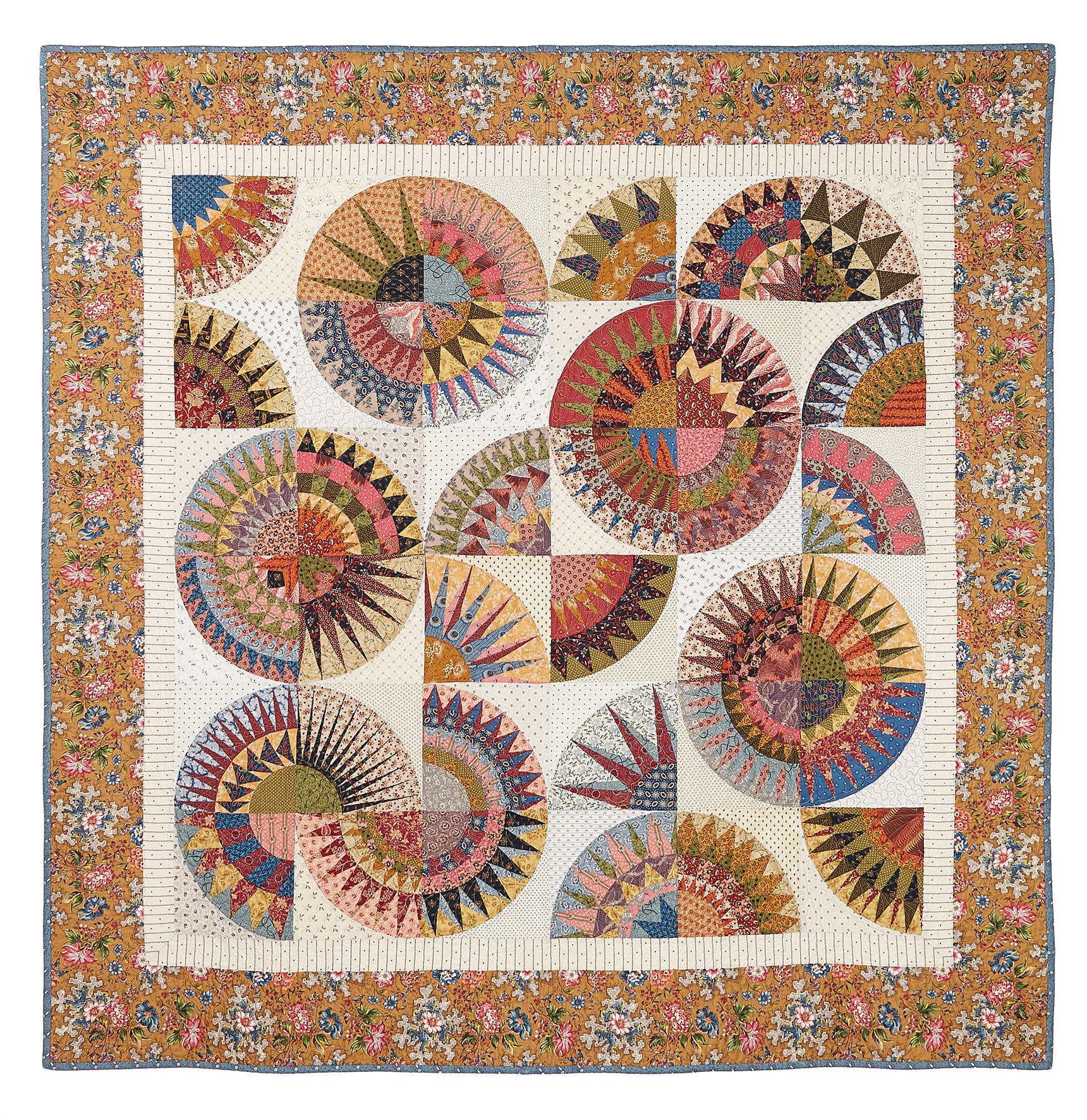 This quilt is inspired by a number of circular patchwork designs from years gone by. Ballaarat Beauties consists of elements from antique quilts such as New York Beauty, Whig's Defeat, Georgetown Circle, Mariner's Compass and Sunburst, as well as many original designs. There are 36 blocks, each one of which comprises a pieced quarter circle set into an 8" square. The squares are then straight-set together and the blocks can be laid out to form complete circles or twisted to create different effects. Finished Size 64" x 64"