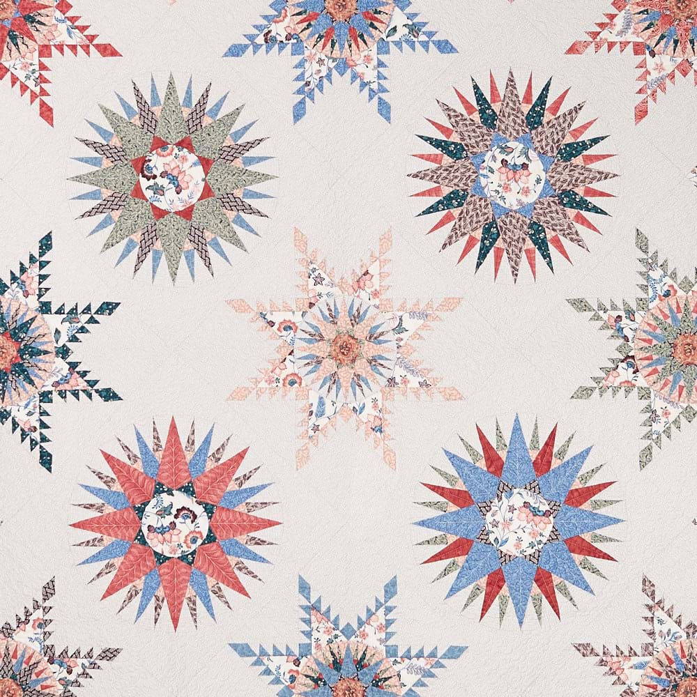This quilt was inspired by a love for both antique Mariner's Compass and Feathered Star quilts. It consists of 13 blocks, 9 Mariners Feathered Star blocks and 4 Mariner's Compass blocks, which are set on point. It is completed with setting triangles in a feature fabric, which is also used in the blocks. It is foundation pieced for ease and accuracy or can be pieced entirely by hand. Finished Quilt Size – 78½" x 78½"