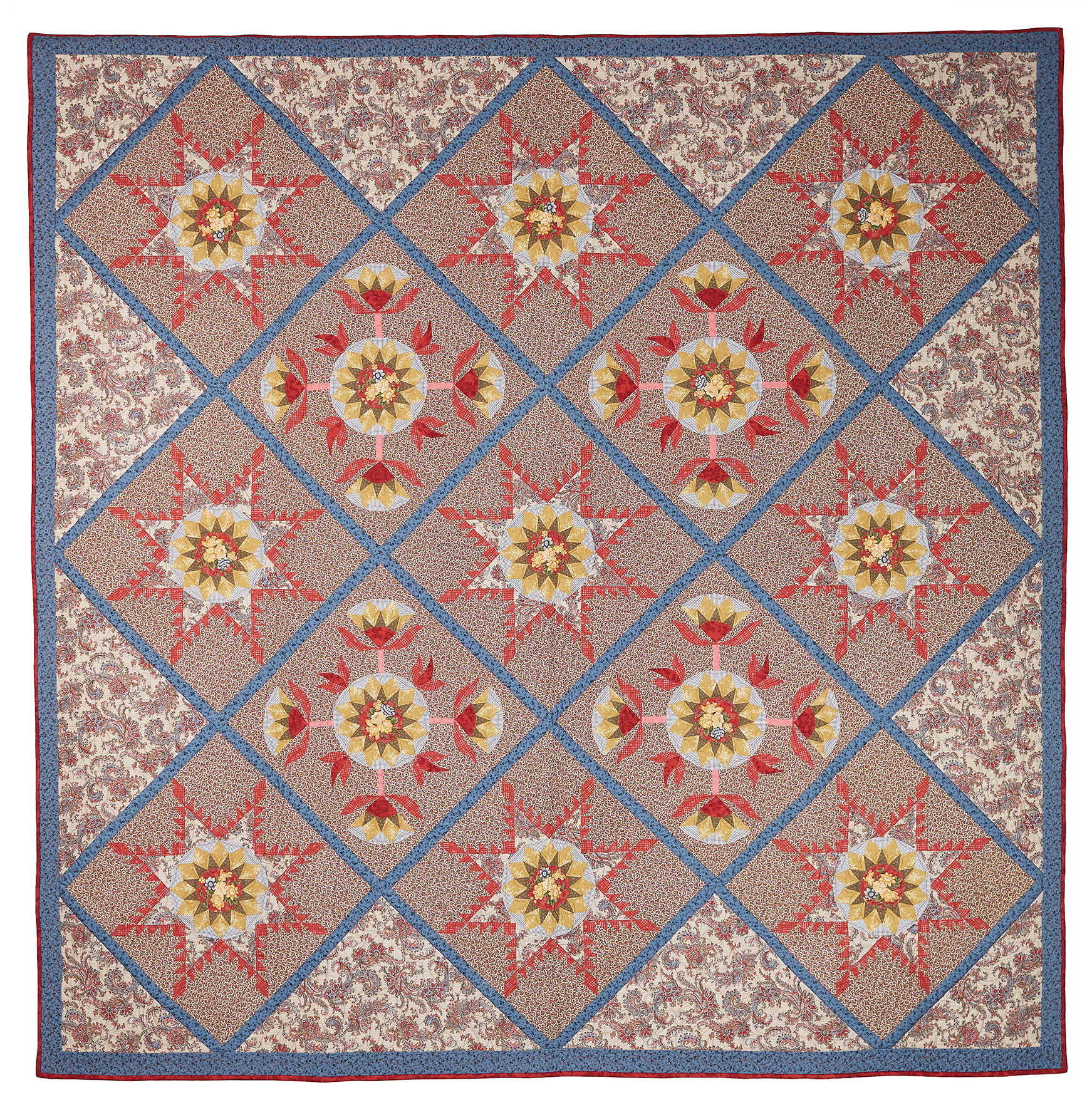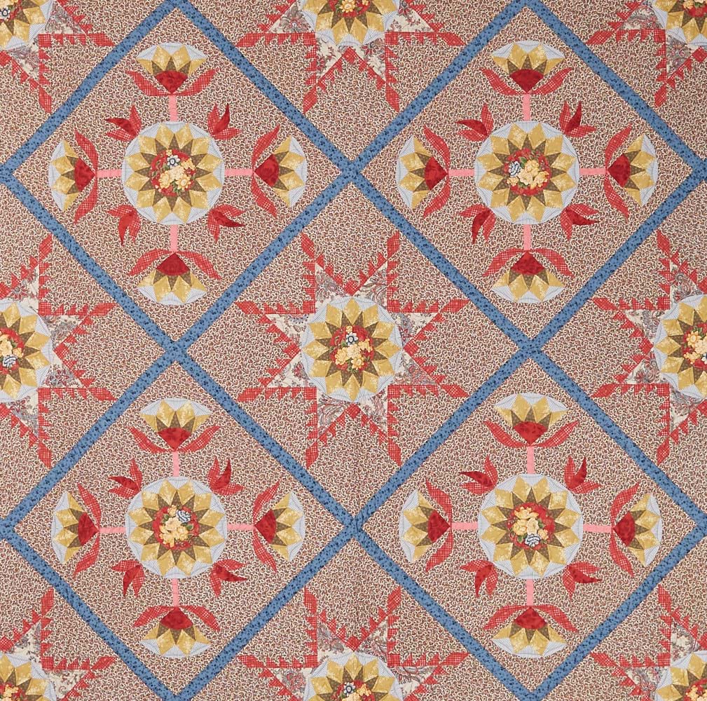 This quilt was inspired by a love for both antique Feathered Star and Sunburst quilts. It consists of 13 blocks, 9 Sunburst Feathered Star blocks and 4 original Sunburst appliqué blocks, which are set on point. It is completed with setting triangles in a feature fabric, which is also used in the blocks. A narrow border completes the quilt. It is foundation pieced for ease and accuracy or can be pieced entirely by hand. Finished quilt size - 86.75" x 86.75"