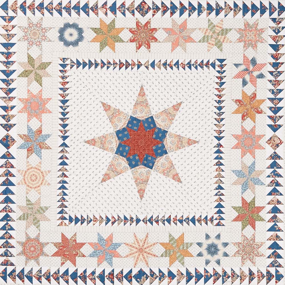 The Gatton Stars quilt is a medallion quilt consisting of a central original block surrounded by a border of Flying Geese and then a border of Le Moyne Stars. A second Flying Geese border is then featured and the quilt is completed with a border of Blazing Star blocks. This beautiful quilt shows the amazing effects that can be achieved by fussy cutting. It was inspired by a teaching challenge to demonstrate and teach students different piecing techniques . It is hand and machine pieced using templates and the Flying Geese borders are foundation pieced for accuracy. Finished quilt size - 72" x 72".