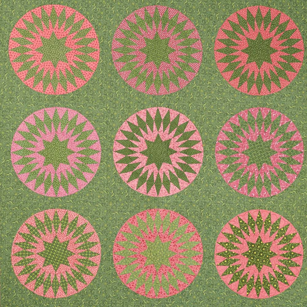 This quilt is a reproduction of a quilt made in America in the mid to late 1800's. The origin of the quilt is unknown, but was possibly Pennsylvania Dutch. It now lives in Australia. The original quilt was also made from a variety of poison green and double pink fabrics.