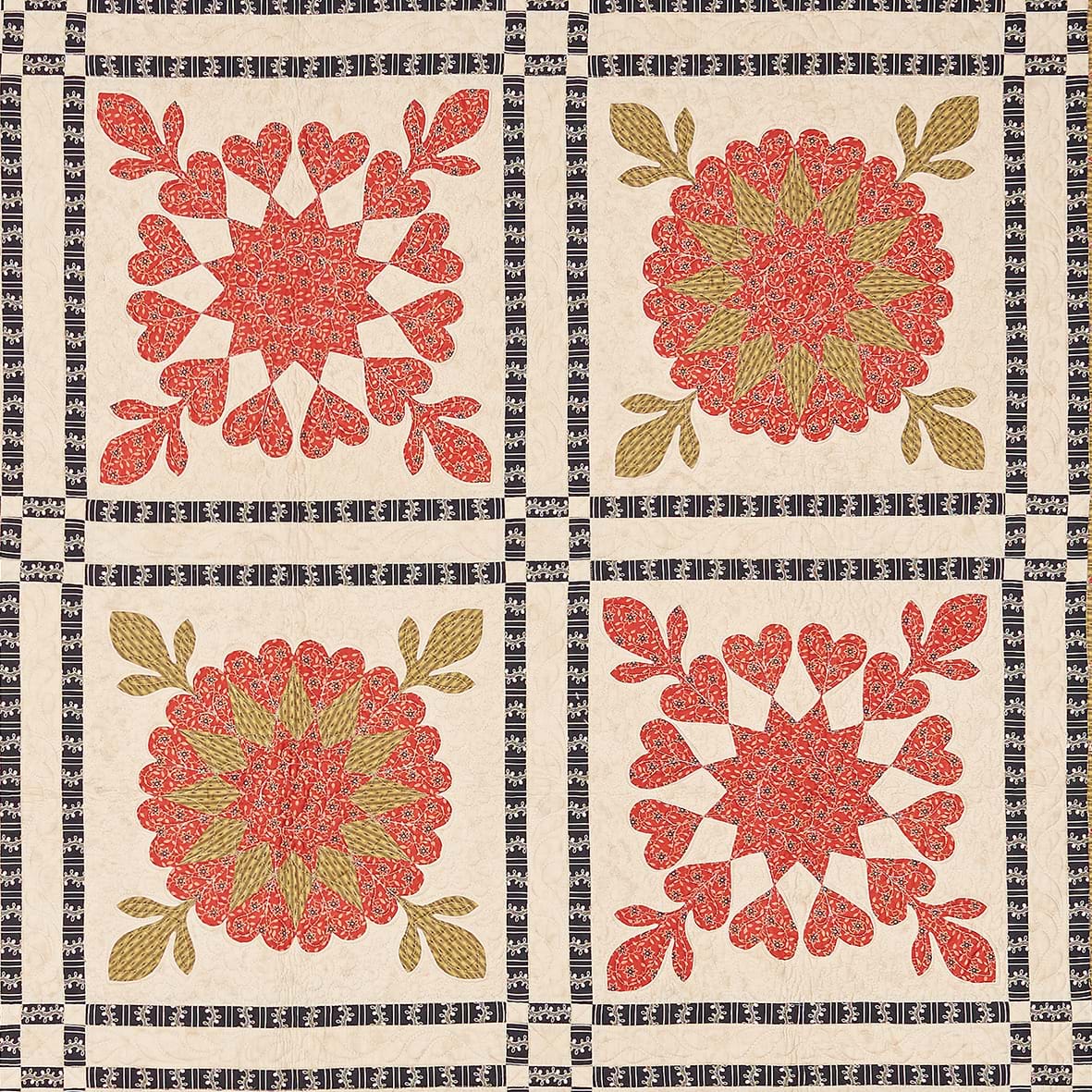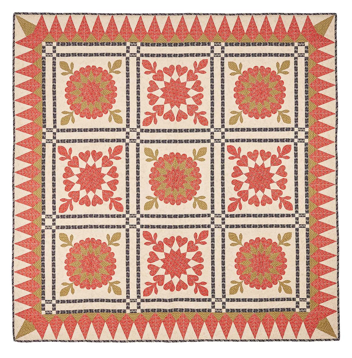 A quilt made in Deep River, Connecticut in 1850 inspired this original quilt design. The antique quilt was made by Sarah Mary Stevens Bailey and consisted of an appliqué block repeated throughout the quilt, set on point with pieced sashings. Sarah's Wreath consists of nine pieced and four appliquéd blocks, straight set with pieced sashings and completed with a pieced diamond border. It is hand appliquéd and machine pieced, but can be entirely pieced by hand if preferred. Finished Quilt Size - 69" x 69"
