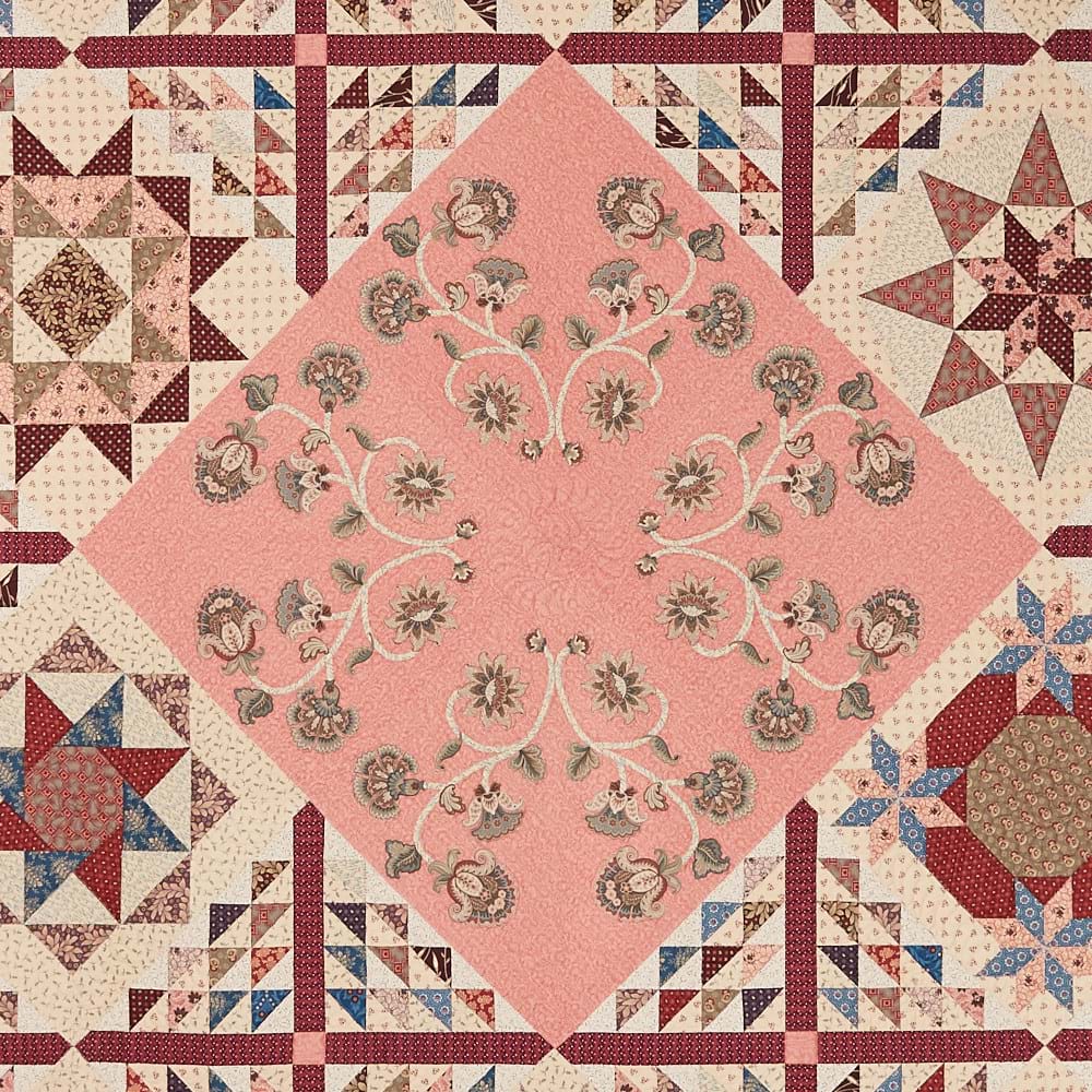 This quilt was started in 2010 as part of a series of 9 blocks designed for a websampler quilt using the Civil War Tribute fabric range. Nine Australian shops each designed a quilt using these blocks as a basis for their design. Th=is quilt uses seven of the original blocks plus 4our additional pieced blocks , one of which is used as the alternate block and as the setting triangles, Four Broderie Perse blocks, set on point, create a central focus for the quilt. the Broderie Pers and sampler blocks are pieced by hand. The Windmill blocks are machine foundation pieced. The block are assembled old post. Finished size - 735/8” x 947/8”